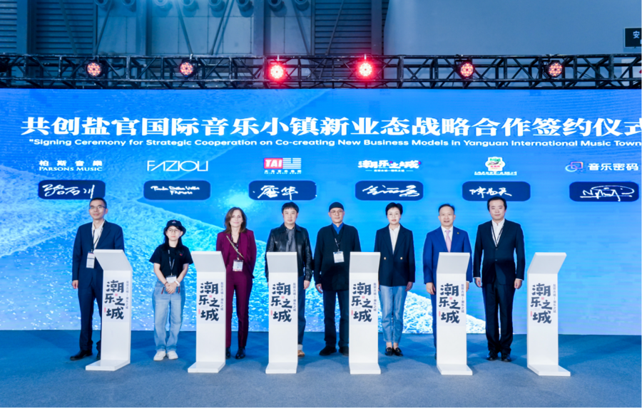 10月22日揭幕的中国(上海)国际乐器展览会上,盐官古城-潮乐之城作为世界音乐小镇首次亮相,并发布《音乐生态共创合作倡议书》,与太合音乐集团、柏斯音乐集团、上海民族乐器一厂(敦煌乐器)、意大利FAZIOLI 钢琴、“音乐密码”杭州可视可感科技等音乐厂牌、头部企业开展深度合作。