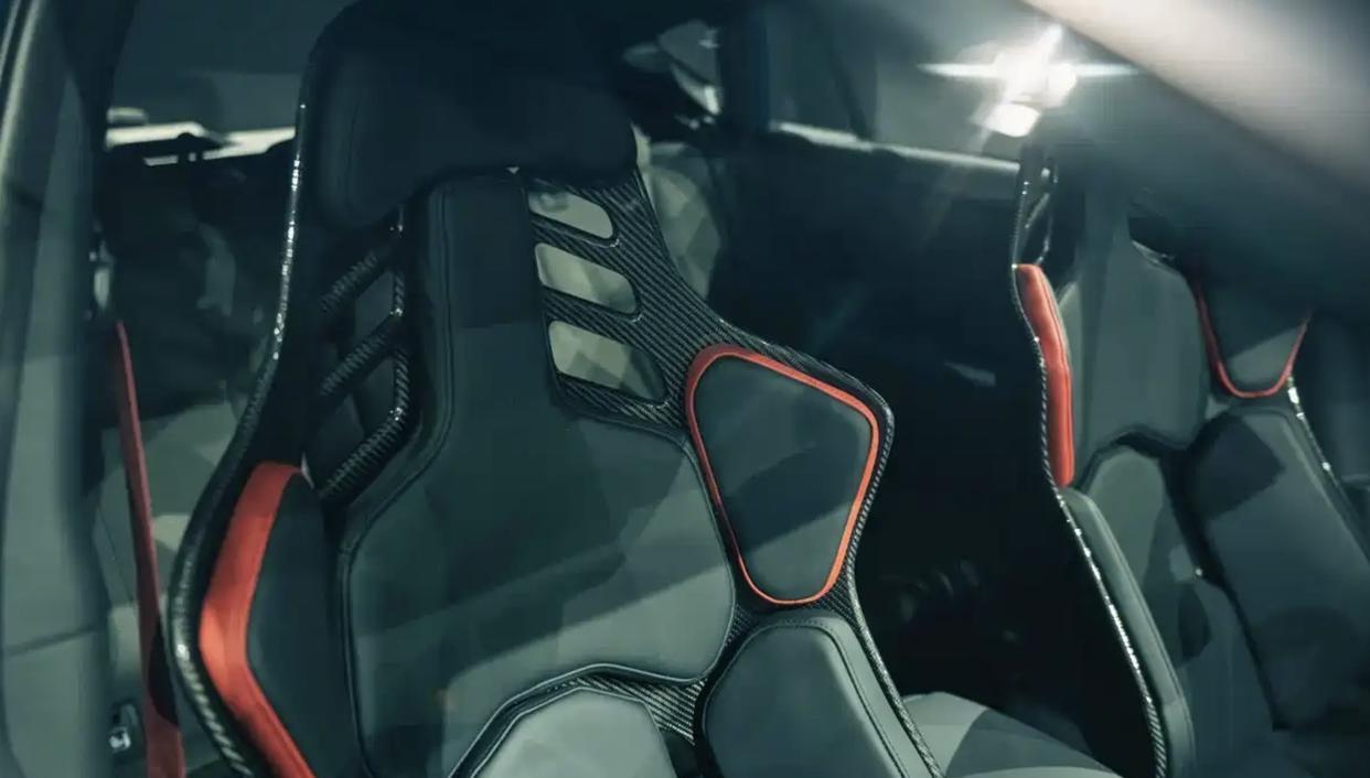 内饰依旧充满着赛车气息,配备更加运动的且轻量化的碳纤维壳体的Recaro桶形座椅,还加入了薄绒材质的铺陈,加快加厚的侧翼加入了红色皮革材质的衬垫,脖颈位置采用了镂空的样式,不仅轻量化,也带来了更好的包裹性和支撑性。中控台依旧采用了大家熟悉的经典的T字形结构,通过不同种材质的运用,带来了丰富的层次感。镂空式三辐方向盘采用了防滑的麂皮绒包裹,红色的一键启动按钮在方向盘右下侧(类似于法拉利的设计),再加上极具复古气息的“光头”手动换挡拨杆和脚底下的三个踏板,提升了整车的运动气息。