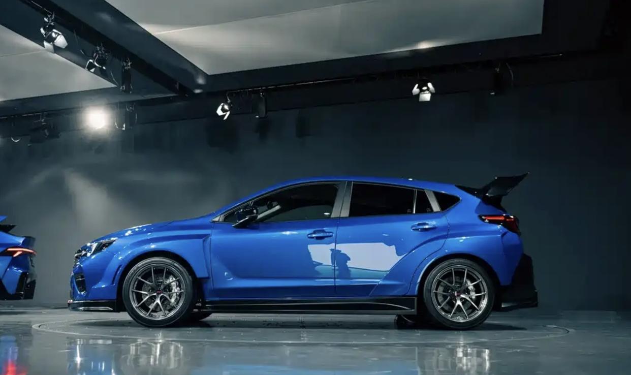 车身采用了经典的两厢车身设计,换上了经典的蓝色车漆涂装,以及红色细节点缀,同时提供粉色的Subaru Tecnica International斯巴鲁标识。黑色的车窗饰条与隐私玻璃巧妙结合在一起。黑色的轮眉、侧裙与碳纤维材质的前后唇融为一体,凸显出它宽体的特质。18英寸的Y字形交错的锻造的金色轮圈搭配着巨大的Brembo卡钳和镂空式通风刹车盘,与之匹配了245/40 R18运动轮胎,再加上碳纤维后视镜和车窗边缘的黑色装饰条,营造出低趴的姿态。尺寸方面,车身的长宽高4415*1740*1440mm,轴距2525mm,车内采用5座布局,还有着401L行李厢容积,实用性不错。