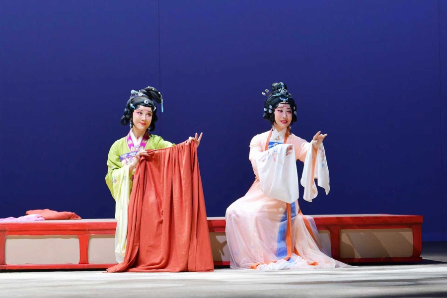 同样是传统文化的演绎,广州粤剧院的《双绣缘》以粤剧为载体,将“广绣始祖”卢眉娘的传奇故事搬上舞台,实现了两大非物质文化遗产的碰撞与融合。全剧舞台简洁,唐风妆造精美,如同打开了一幅典雅的“唐代仕女图”。演出在上海宛平剧院演出的上座率超过90%,也让昆剧表演艺术家梁谷音赞叹“精致、淡雅,又让人惊艳”。