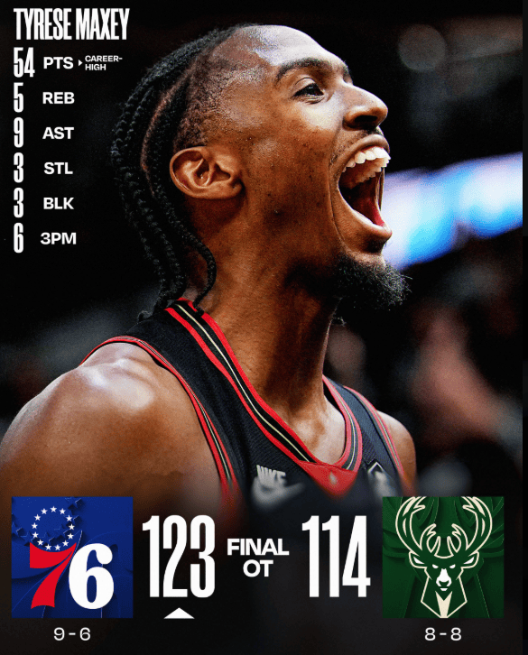 NBA官推发文称:泰雷斯-马克西砍下生涯新高的54分,成为自1973-74赛季以来第7位单场得到50分、3抢断和3盖帽的球员,带领费城76人队通过加时赛获胜!